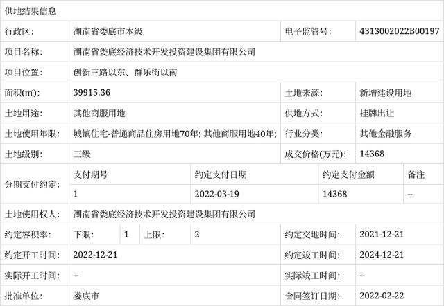 掛牌出讓供地結果信息(湖南省婁底經(jīng)濟技術開發(fā)投資建設集團有限公司-創(chuàng)新三路以東、群樂街以南)